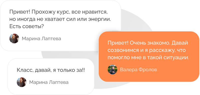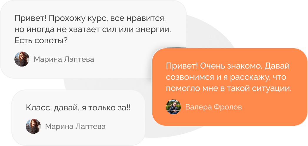 Станете частью мотивирующего сообщества единомышленников, с которыми можно делиться успехами, получать наставления и вдохновляться на пути к целям.
